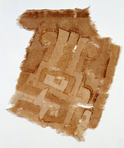 ペルー、チャビン文化の時代にはジャガーに似た猫科動物を主神とする宗教が広まっていたと考えられており、北部高地にある大神殿跡のチャビン・デ・ワンタル遺跡では牙を剝(む)く獣神たちの浮彫彫刻が石板や石柱等に表されています。その信仰の拡大を示すかのように、主に乾燥の激しい南部海岸地方の遺跡からこの獣神と同様のモチーフの描染裂(かきぞめぎれ)などが見つかっています。この裂もそのひとつ。木綿平織地に茶の濃淡で獣神の横顔を描いています。鋭い牙を剥き、上目づかいににらみつける表情にチャビン文化の獣神の特徴が良く表れています。宗教施設を飾るための布であったのかあるいは衣装の一部であったのかは不明です。