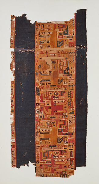 綴織の文様帯と濃紺の平織地の帯を交互に配した裂で、おそらく貫頭衣であったと考えられます。表された文様はティアワナコ文化の神殿の「太陽の門」に刻まれた浮彫彫刻がもとになったもので、錫杖を持って走る鳥人の姿をやや抽象化し、向きも互い違いにして表しています。